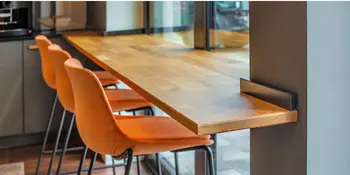 Holztisch mit orangenen Barstühlen