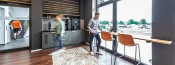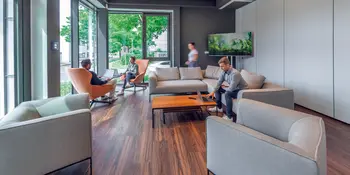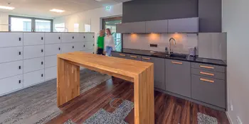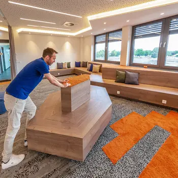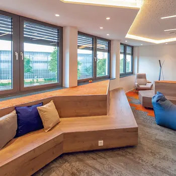 Unsere Tischlerei war an zahlreichen Elementen der Inneneinrichtung beteiligt. Unter anderem haben wir einen individuellen Empfangstresen, diverse, teils gepolsterte Sitzmöbel, Teeküchen, die Kantine und mobile Sitzgelegenheiten für agiles Arbeiten gefertigt.
